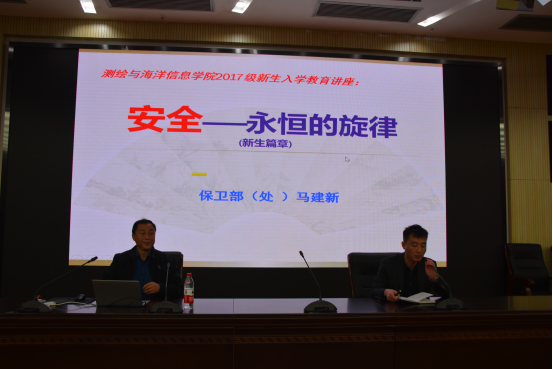 为使2017级新生拥有更好的校园生活,积极创建平安校园,维护大学新生人身、财产安全,提高大学新生的安全防范意识与自我保护能力,2017年10月20日下午,测绘与海洋信息公司于黄海厅举行了2017级新生入学安全教育讲座。校保卫处处长马建新作专题讲座。