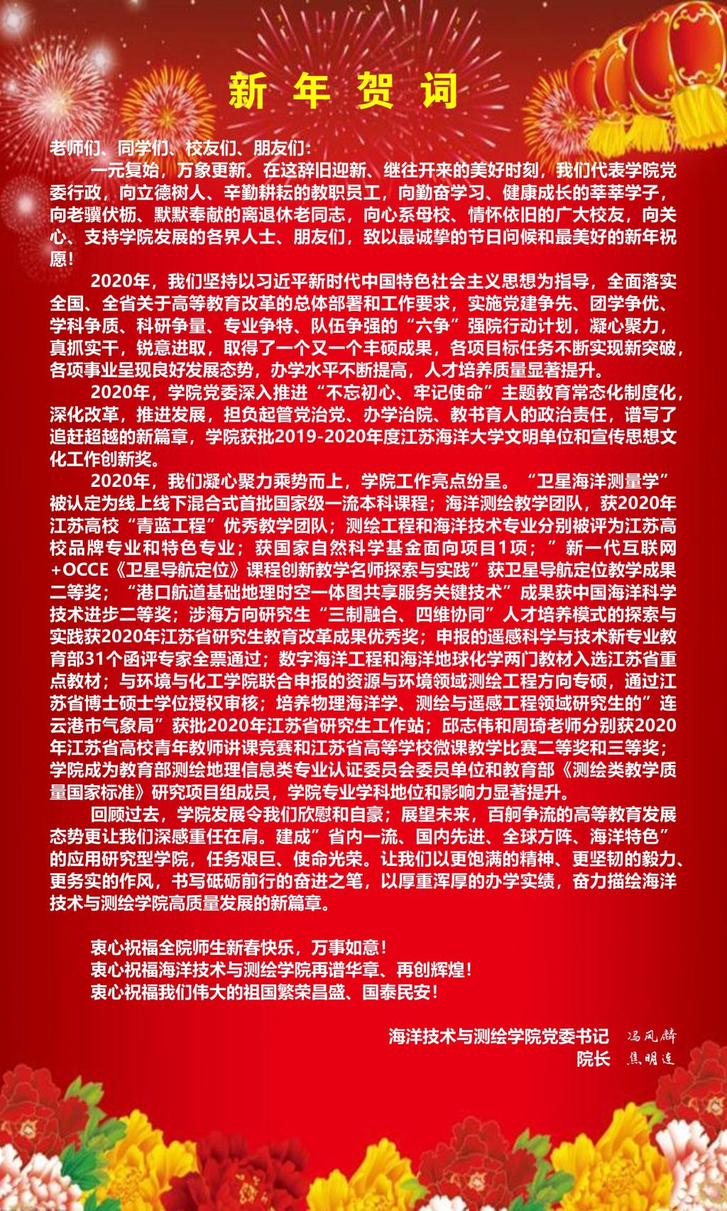 2020年,我们凝心聚力乘势而上,公司工作亮点纷呈。“卫星海洋测量学”被认定为线上线下混合式首批国家级一流本科课程;海洋测绘教学团队,获2020年江苏高校“青蓝工程”优秀教学团队;测绘工程和海洋技术专业分别被评为江苏高校品牌专业和特色专业;获国家自然科学基金面向项目1项;”新一代互联网+OCCE《卫星导航定位》课程创新教学名师探索与实践”获卫星导航定位教学成果二等奖;“港口航道基础地理时空一体图共享服务关键技术”成果获中国海洋科学技术进步二等奖;涉海方向研究生“三制融合、四维协同”人才培养模式的探索与实践获2020年江苏省研究生教育改革成果优秀奖;申报的遥感科学与技术新专业教育部31个函评专家全票通过;数字海洋工程和海洋地球化学两门教材入选江苏省重点教材;与环境与化工公司联合申报的资源与环境领域测绘工程方向专硕,通过江苏省博士硕士学位授权审核;培养物理海洋学、测绘与遥感工程领域研究生的”连云港市气象局”获批2020年江苏省研究生工作站;邱志伟和周琦老师分别获2020年江苏省高校青年教师讲课竞赛和江苏省高等公司微课教学比赛二等奖和三等奖;公司成为教育部测绘地理信息类专业认证委员会委员单位和教育部《测绘类教学质量国家标准》研究项目组成员,公司专业学科地位和影响力显著提升。