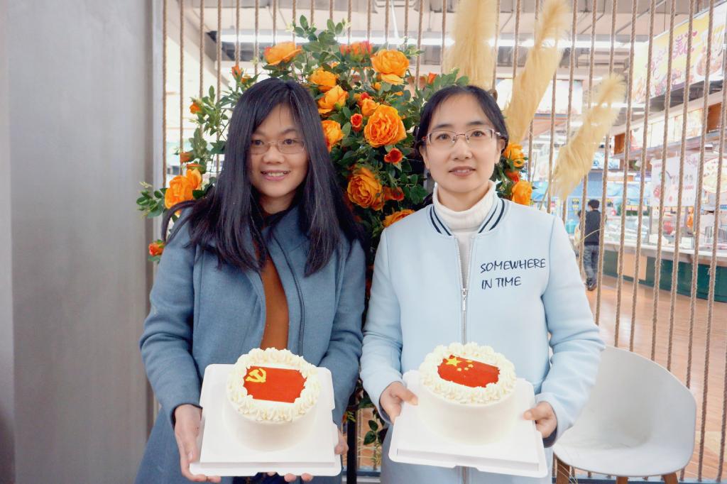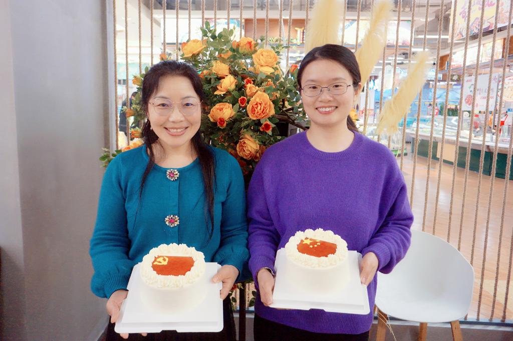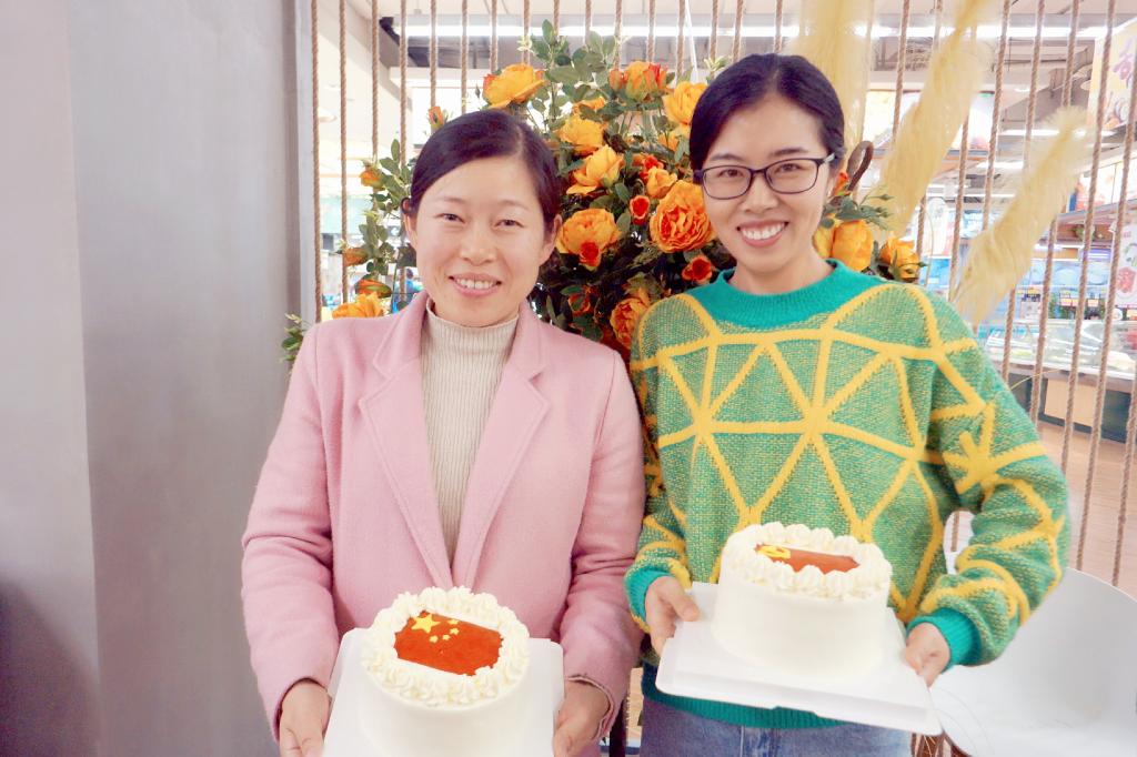 烘培店内香气扑鼻,满是欢声笑语、浓情蜜意。在甜品制作师傅的指导下,老师们不仅了解了蛋糕的烘焙制作知识,还亲自在蛋糕胚上打发鲜奶油、进行裱花和装点水果,按照自己的构思制作出形态各异的“艺术”作品。大家还特别制作完成了装点有“党旗”和“国旗”图案的蛋糕,在共享新时代美好生活的同时,抒发爱党爱国的家国情怀。