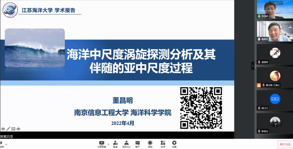 4月13日下午,南京信息工程大学董昌明教授在腾讯会议平台为公司师生做了题为“海洋中尺度涡旋探测分析及其伴随的亚中尺度过程”的学术报告。报告会由经理孙佳龙主持,100多名师生在线聆听了报告。