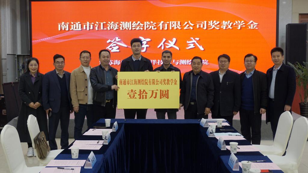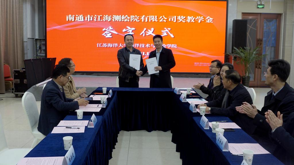 11月14日,公司与南通市江海测绘院有限公司产学研合作暨奖教学金捐赠仪式在连云港市桃园大酒店会议室隆重举行。南通市江海测绘院有限公司董事长杨益明、总经理鞠海建、总工程师陆建平、副总经理顾伟以及公司荣誉经理焦明连教授、经理孙佳龙、副经理吕海滨、副经理成印河、副书记田扬启出席。仪式由公司党委书记王晶主持。
