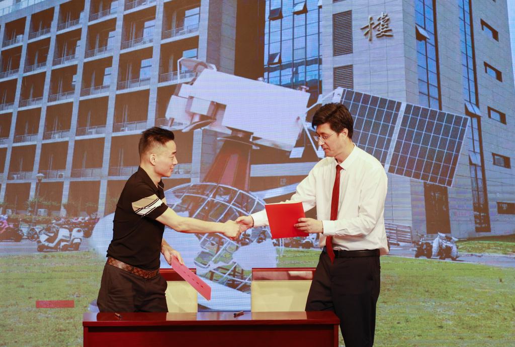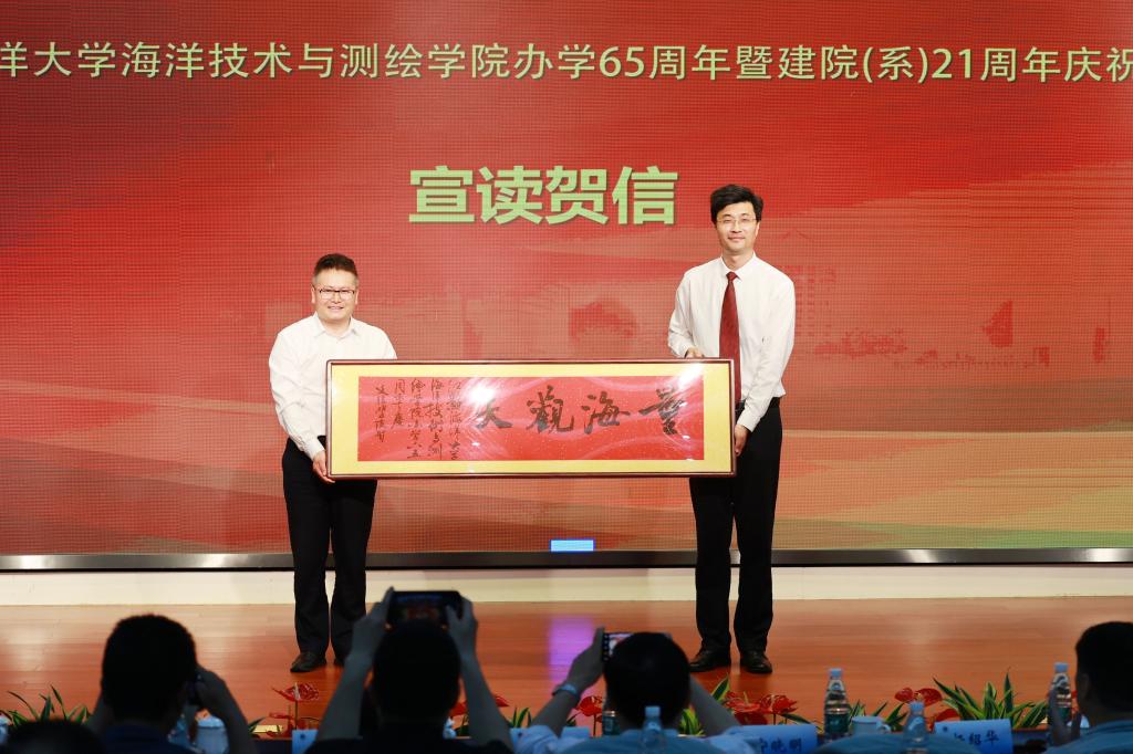 庆典前夕,公司收到武汉大学、中南大学、中国矿业大学、上海海洋大学、广东海洋大学等20余所友好高校的兄弟公司和30余家产教融合企事业单位发来的贺信贺电,高度评价公司数十年来的办学成就,工作人员宣读了武汉大学测绘公司的贺信。土木与港海工程公司党委书记王改红代表兄弟公司致贺词,文法公司经理吴明忠赠送“量海观天”祝贺牌匾。大会最后,举行了公司地标捐赠仪式,孙佳龙与员工代表刘小进签署了捐赠协议。