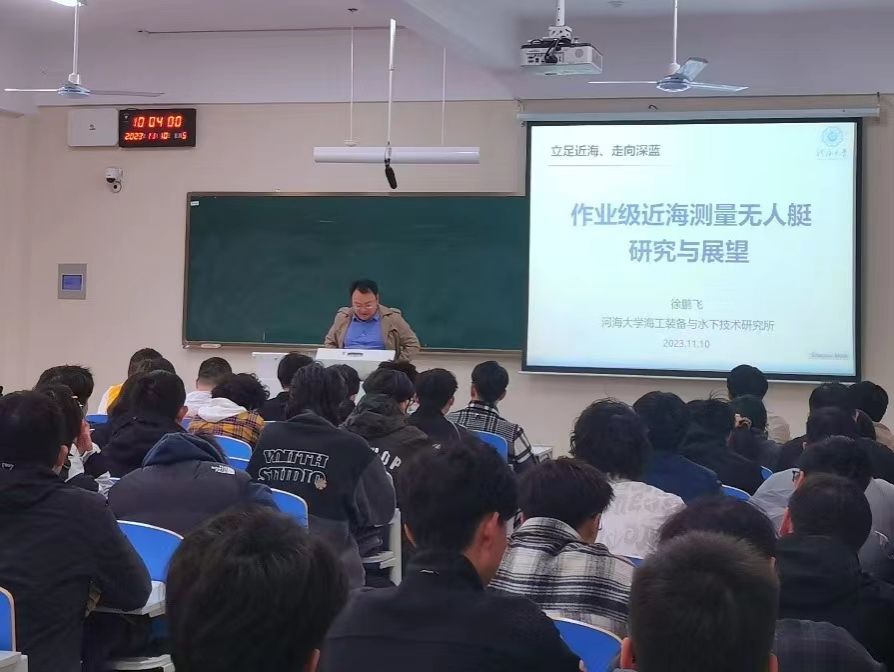 上午10时,徐鹏飞走进苍梧校区文思楼108教室,为2023届测绘工程专业毕业生做了《测绘科学与技术进展》专题报告,主要介绍了“立足近海,无人进入,智能探测,绿色开发,走向深蓝”科研团队建设思路。近年来,他所在团队面向国家海洋生态文明建设,顺应近海污染监测、生态监测以及水工/港航结构物水下检测与修复等实际需求,研发了多功能无人艇、水下机器人以及水下三维激光扫描仪等新技术。他希望同学们要关注本专业的新技术发展,发挥海洋技术特色优势,勤奋学习打牢专业基础,立志成长为国家和社会需要的优秀专门人才。