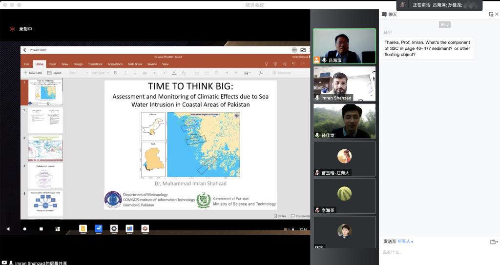 穆罕默德.伊姆兰.沙赫扎德教授的报告题目为“是时候大胆思考了:海水入侵对巴基斯坦沿海地区气候影响的评估和监测(Time to Think Big: Assessment and Monitoring of Climatic Effects due to Sea Water Intrusion in Coastal Areas of Pakistan)”。他介绍了海平面上升、海水入侵对北印度洋沿岸国家,特别是巴基斯坦的重要影响,然后分别介绍了印度河三角洲岛屿的时空变化特征、卡拉奇沿海城市陆地沉降的遥感研究、用合成孔径雷达(SAR)干涉测量法对地震引起的地表形变的估计、使用Landsat-7图像对印度河三角洲地区悬浮固体浓度的经验估计等研究成果,并与参会师生展开学术讨论,回答了老师们提出的问题。