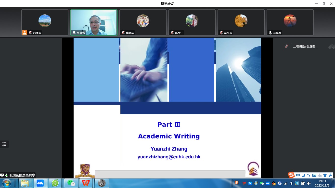 11月9日晚上,香港中文大学荣誉研究员张渊智应邀在“腾讯会议”平台为公司师生做“英文科技文章写作技巧与案例分析”学术报告,经理孙佳龙主持报告会,70多名师生参加学习并交流。