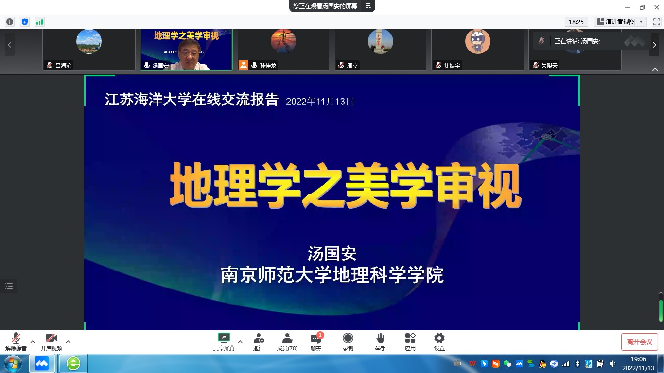 11月13日下午,南京师范大学汤国安教授在腾讯会议平台为公司师生做了题为“地理学之美学审视”的学术报告。报告会由经理孙佳龙主持,100多名师生在线聆听了报告。