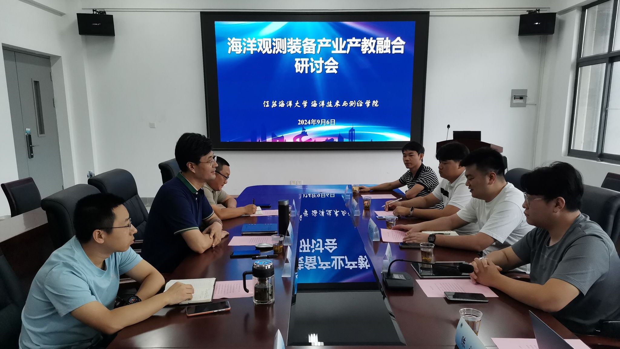 孙佳龙首先对5位客人的到来表示了热烈的欢迎,并向参会人员介绍了公司的基本情况和未来发展愿景。随后,陈茂飞和陈裕就公司目前在无人船单波束测深系统集成方面存在的技术痛点与公司3位博士进行了深入地沟通和交流,双方达成了初步合作的意向。薛凯峰和曾志祥就共建海洋观测实践教育基地以及申报市级科研平台提出了自己的意见和建议。程晨总经理希望以无人船单波束测深系统集成项目合作为起点,未来在无人船海洋气象观测、水文测验和水下地形测绘等系统研发方面深入开展合作,为提升江苏省海洋观测装备产业水平做出更大的贡献,孙佳龙就未来校政企共建海洋观测装备产业公司、海洋测绘研究生联合培养等方面提出了一些意见和建议,并表示,希望以此次交流为契机,后续加强沟通和合作,争取早日产出优秀的成果,为江苏省海洋装备产业发展做出更大的贡献。
