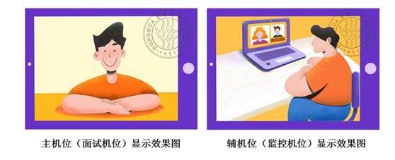 复试前按要求调试好设备,开启摄像头,主机位(面试机位)从正面拍摄,对准考生本人,确保考生双手和头部完全呈现在拍摄画面中。辅机位(监控机位)从考生侧后方45°拍摄,距离1-2米,确保辅机位能从侧后方清晰显示考生上半身及复试环境,复试专家组能够从辅机位清晰看到主机位屏幕。屏幕显示效果图如下: