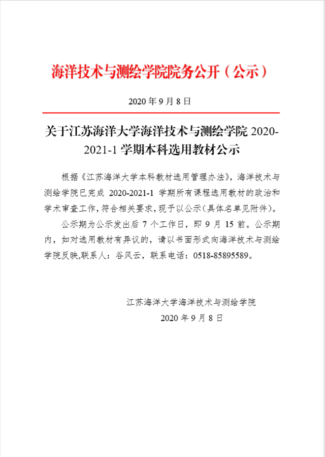 公示期为公示发出后7个工作日,即9月15前。公示期内,如对选用教材有异议的,请以书面形式向BETVLCTOR伟德国际1946反映,联系人:谷风云,联系电话:0518-85895589。