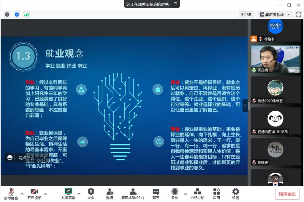 最后,田扬启对大家提出几点建议和要求。第一是正确认清形势,坚定就业信心,披荆斩棘,向着目标奋发;第二是明确就业目标,统筹就业规划,实事求是,选择最适合自己的工作;第三是提升就业能力,积极主动就业,技能上多钻研,心态上少焦虑;第四是珍惜就业机会,主动转“危”为“机”,另辟蹊径,用拼搏把梦想描绘成现实。